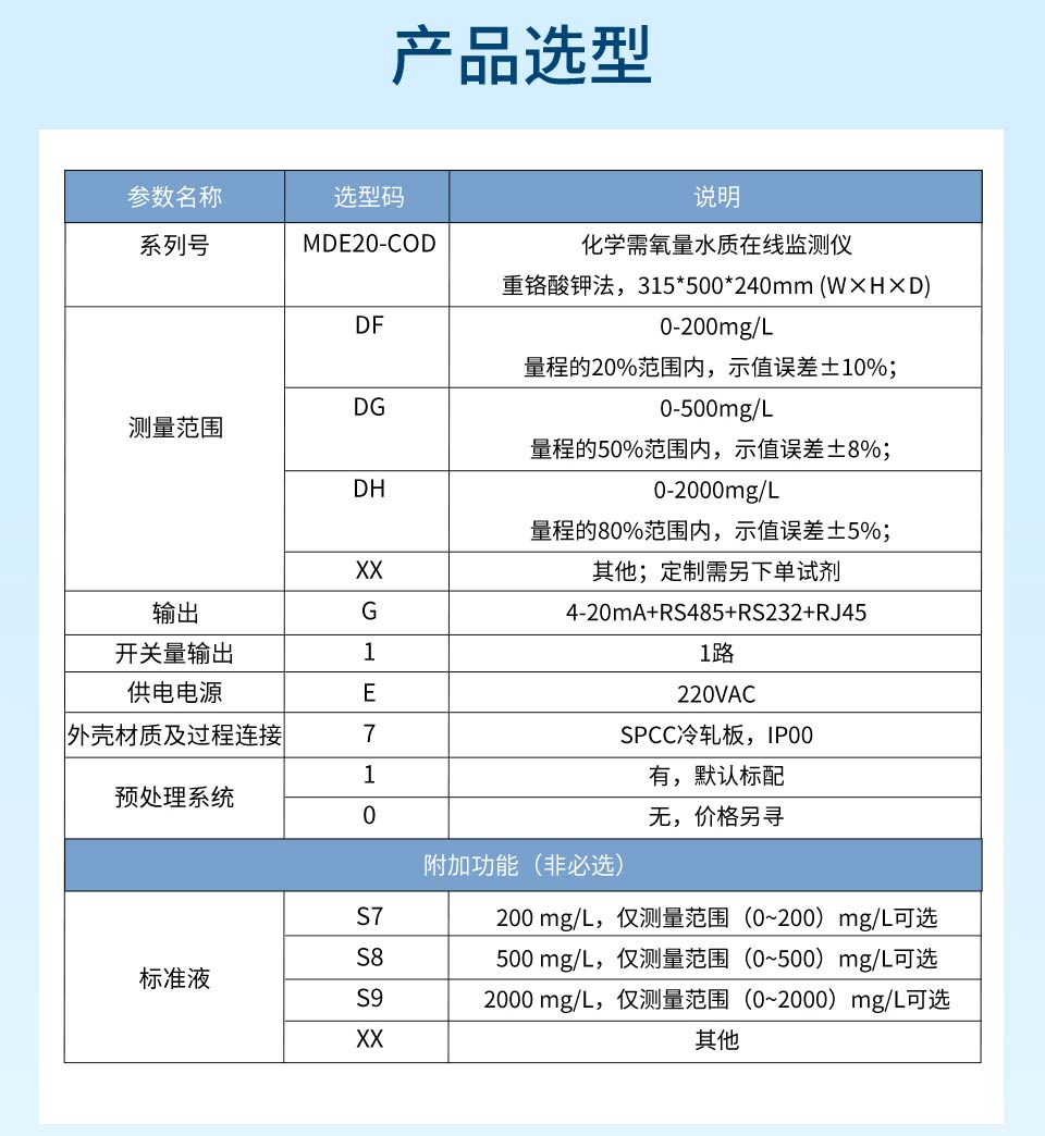 COD水质在线分析仪采用重铬酸盐法检测,符合《化学需氧量(CODCr)水质在线自动监测仪技术要求及检测方法》(HJ 377)、《水质 化学需氧量的测定 重铬酸盐法》(HJ 828)和《水质化学需氧量的测定 快速消解分光光度法》(HJ/T 399)、《污染物在线自动监控(监测)系统数据传输标准》(HJ 212)、《地表水自动监测仪器通信协议技术规定》等标准和规范的要求。