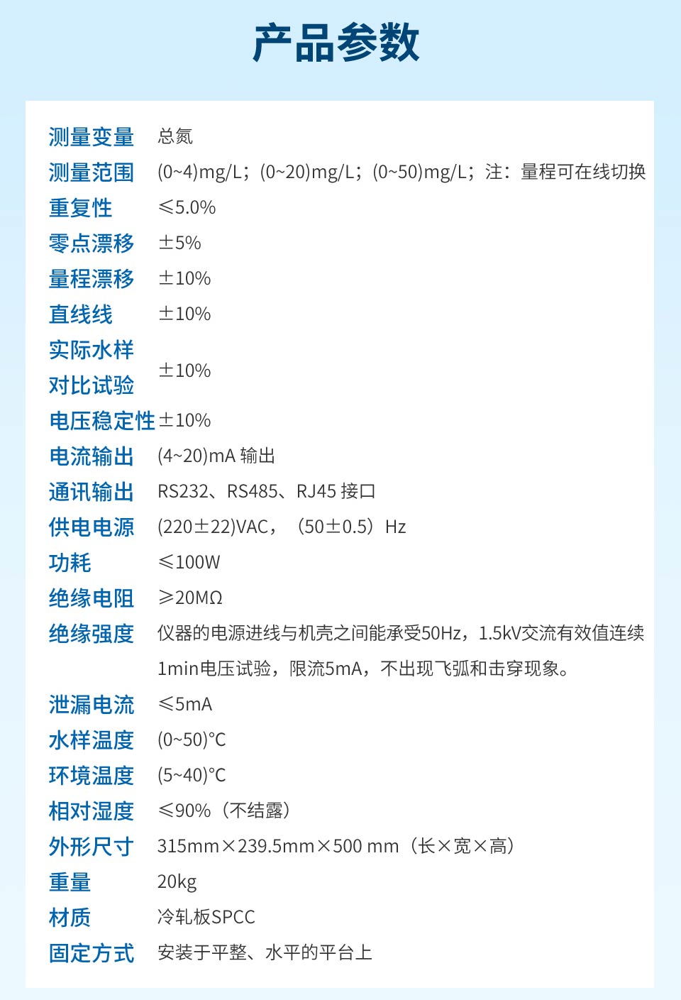 测量范围:(0~200) mg/L;可根据客户需求定制直线性 :±5%定量下限 :≤ 0.2 mg/L重复性 :≤3%