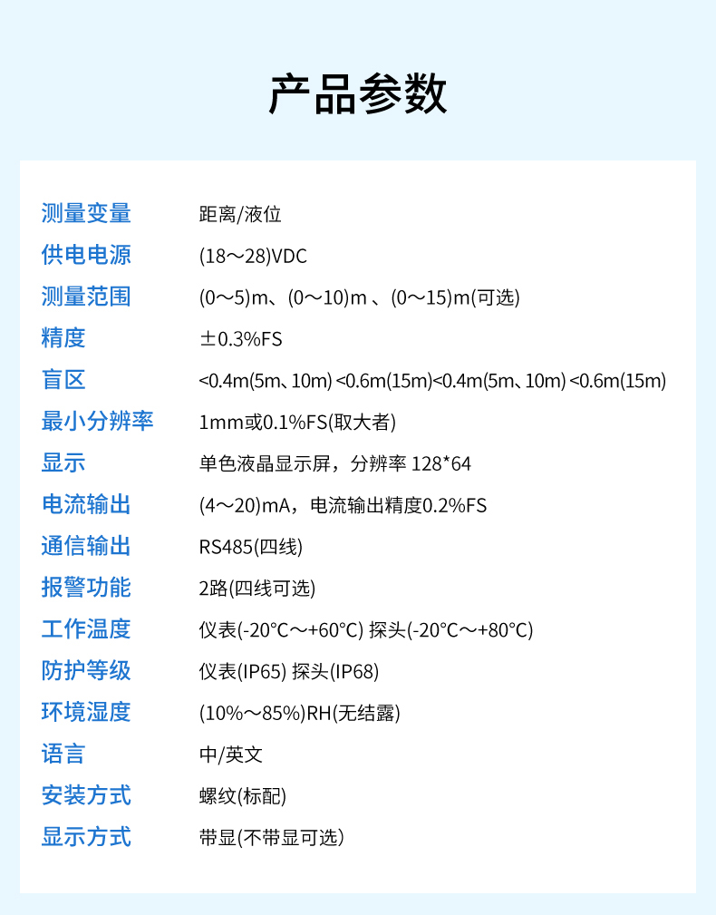 准确度:0.3%FS盲区: ≤0.4m(5m、10m) ;≤0.6m(15m)防护等级:仪表(IP65) 探头(IP68)