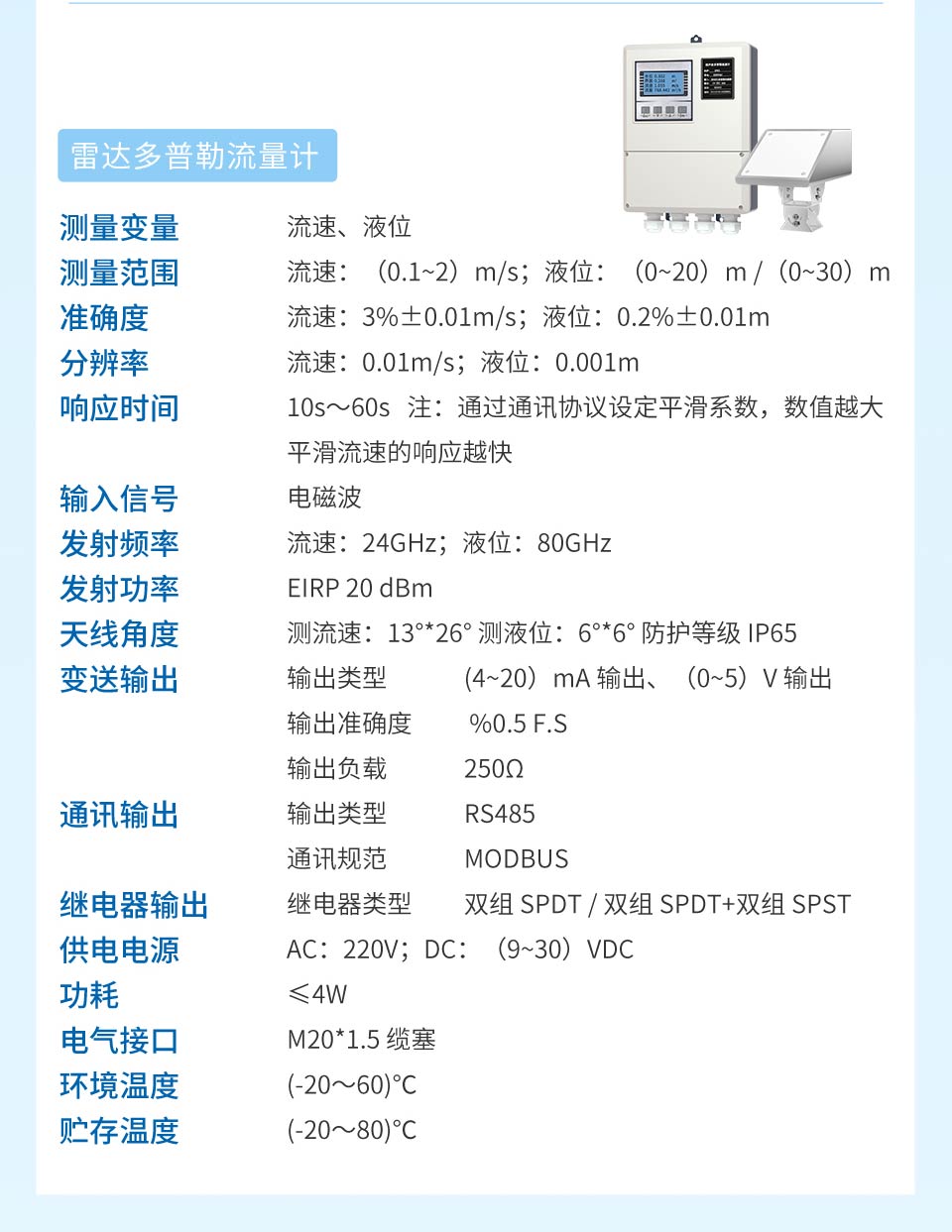 本款雷达多普勒流量计是在自然水域中测量水的流速、水位的仪表。测距雷达单元工作频率为 80GHz,测速雷达单元工作频率为 24GHz。测量点在机体前方,不破坏流场,适用于泥沙悬浮物含量高、水草等漂浮物多和极其严苛的冰期场合的河流中测量。可广泛适用于水位监测站、灌溉支渠、污雨水管网等流量监测。-CN1