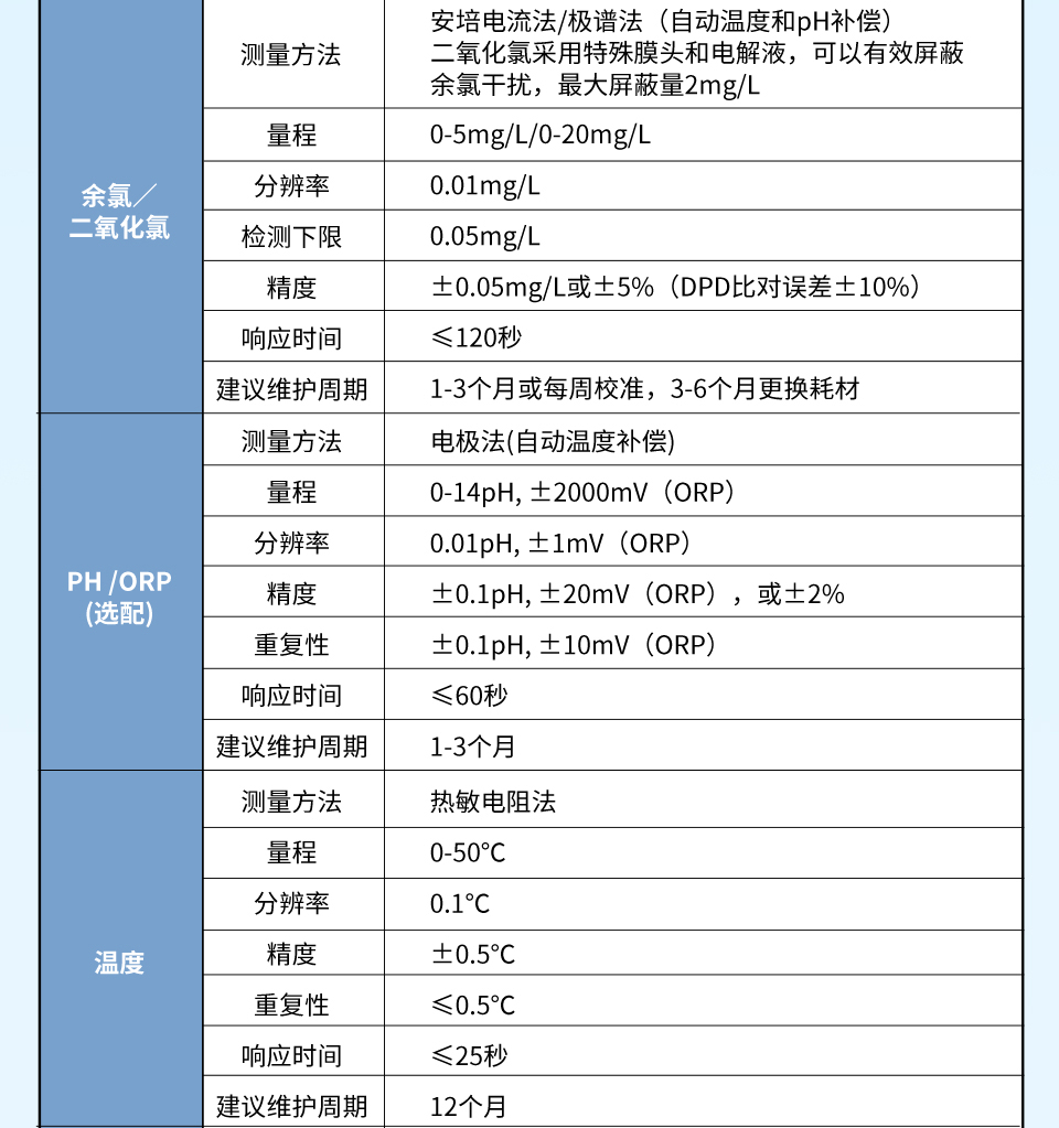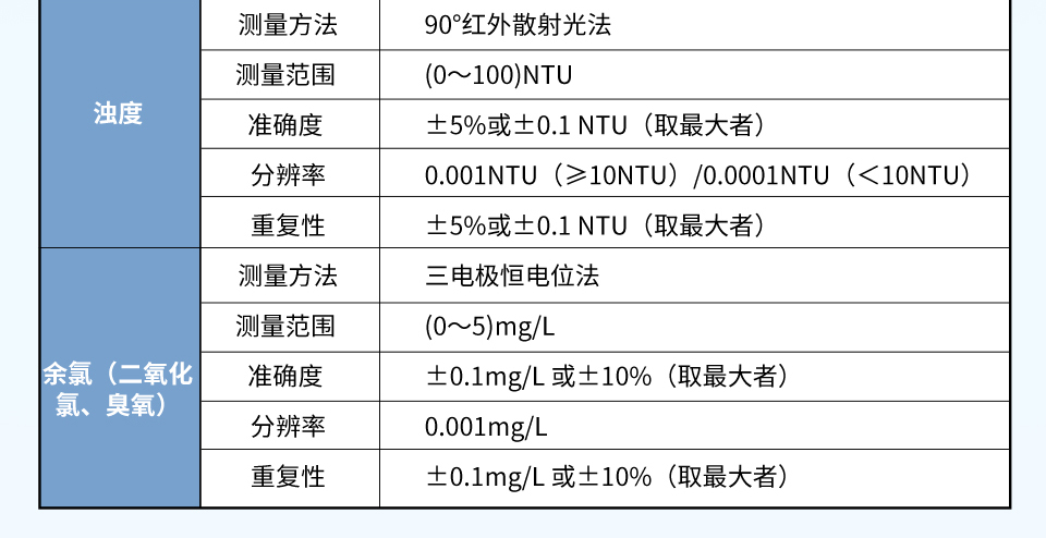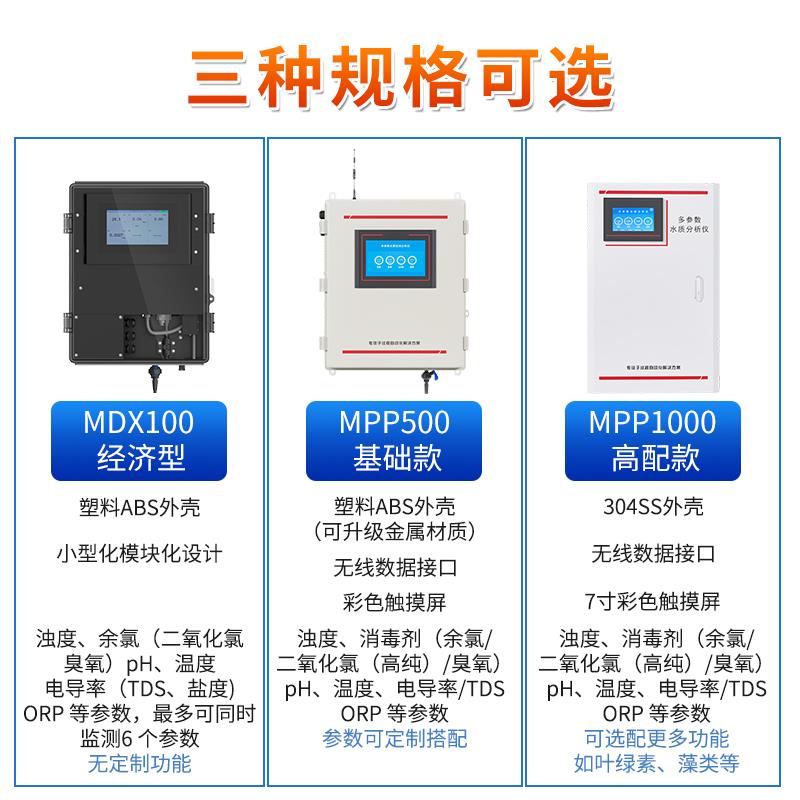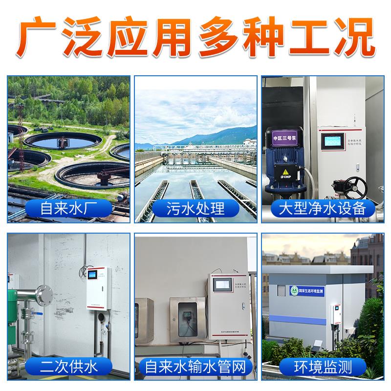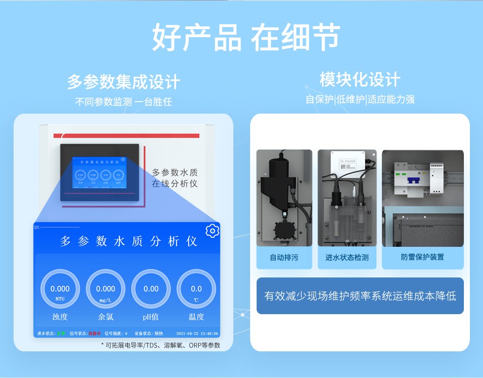 标准版监测参数包括浊度、余氯/二氧化氯、pH、温度。定制版增加参数包括电导率/TDS、溶解氧、ORP等