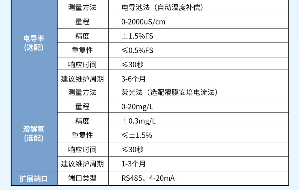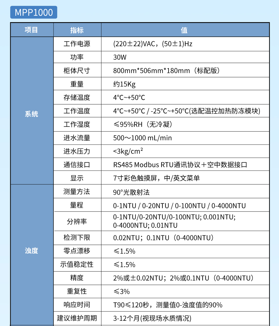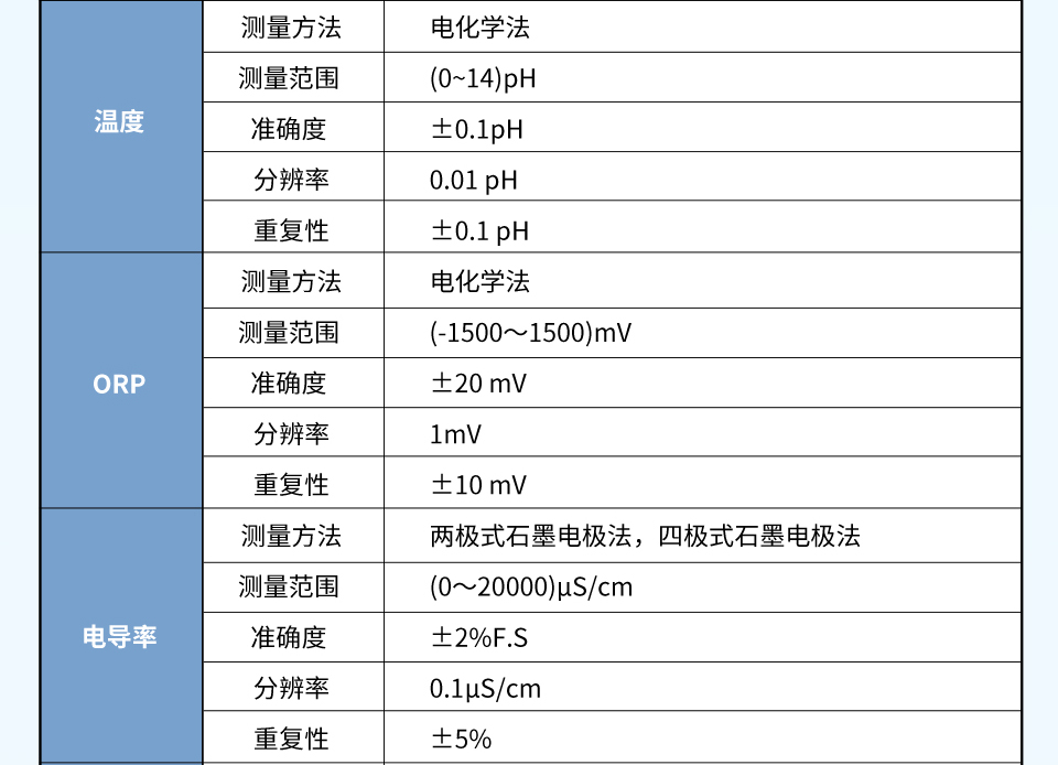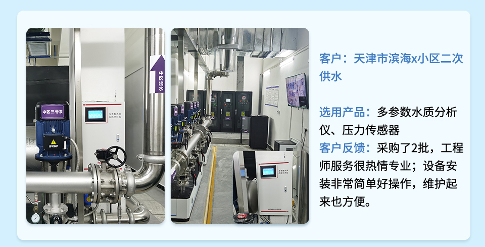标准版监测参数包括浊度、余氯/二氧化氯、pH、温度。定制版增加参数包括电导率/TDS、溶解氧、ORP等