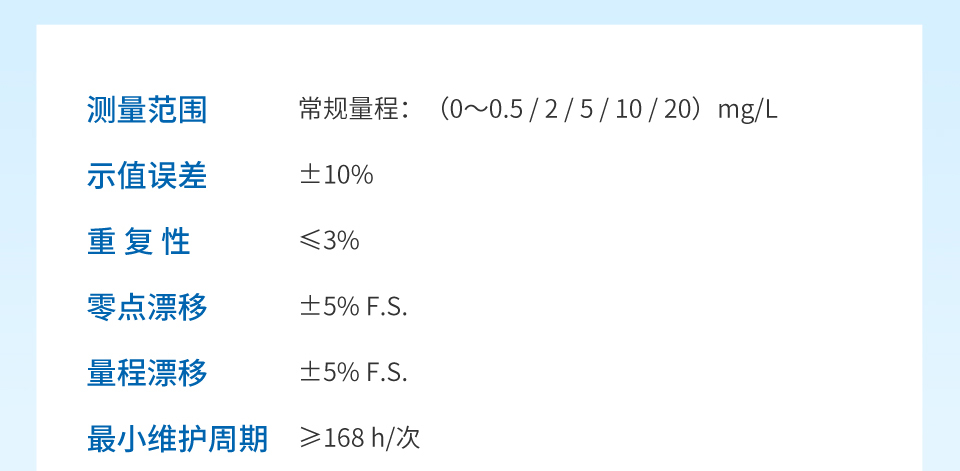 常规量程:(0~0.5 / 2 / 5 / 10 / 20)mg/L示值误差:±10%最小维护周期:≥168 h/次