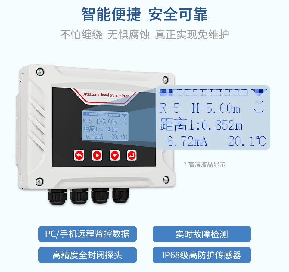 产品特点:非接触式测量; 手机蓝牙调试;故障自诊断技术;环境适应性强;测量值快速响应;自动温度补偿;实时监控回波能量强度
