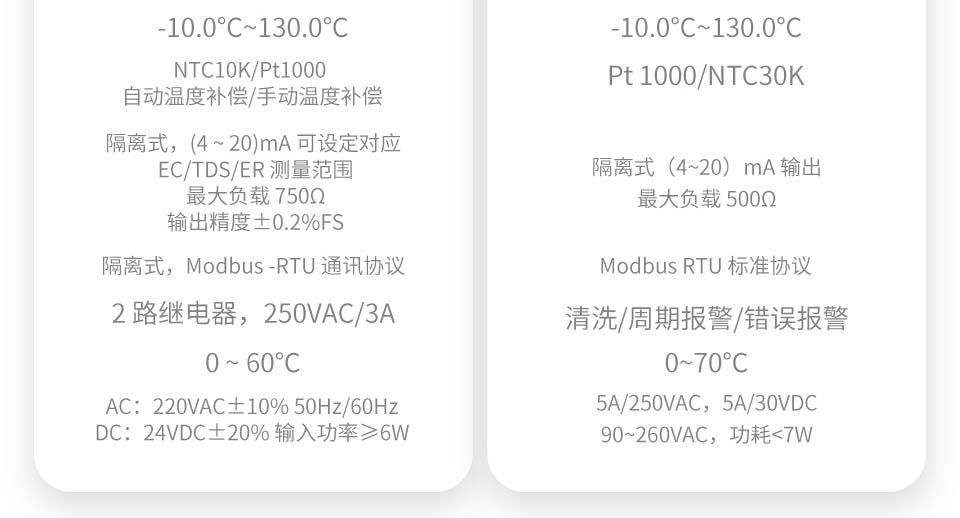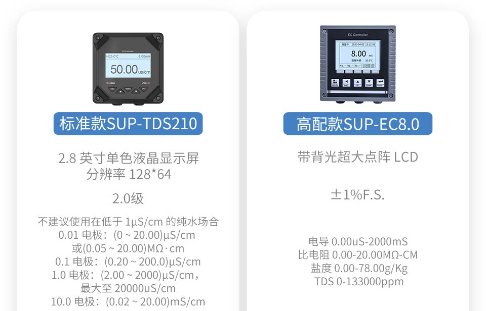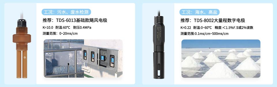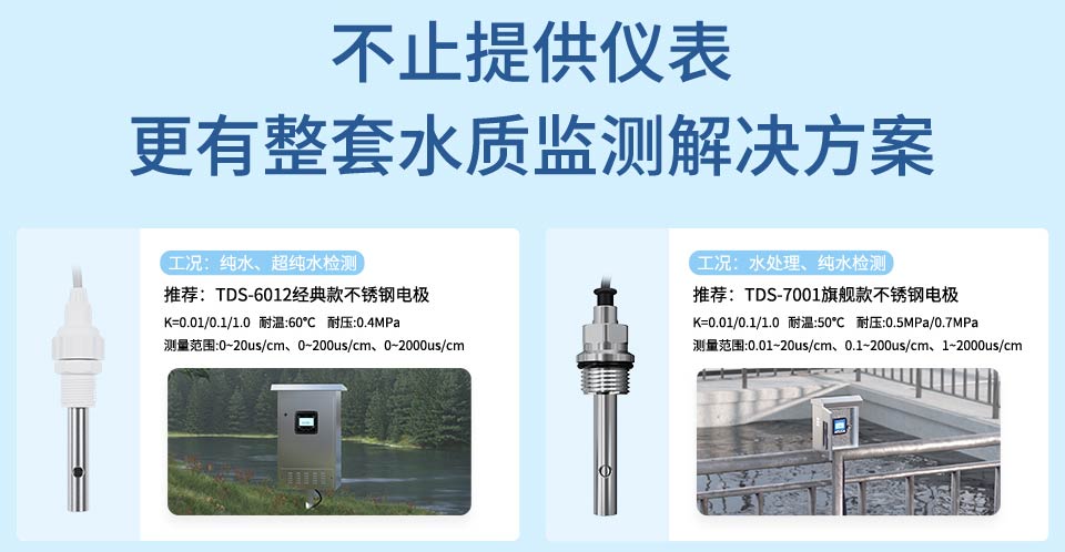 测量范围:电导率:(0~60000)μS/cm;(0.1~100.00)mS/cm TDS:(0~60000)ppm 盐度:(0~100)ppt 温度:(0~60)℃准确度:电导率、TDS、盐度:±2.5%FS 温度:±0.5℃耐压范围: ≤0.6MPa(管道安装)/ 50m⽔深(沉⼊式安装)防护等级:IP68