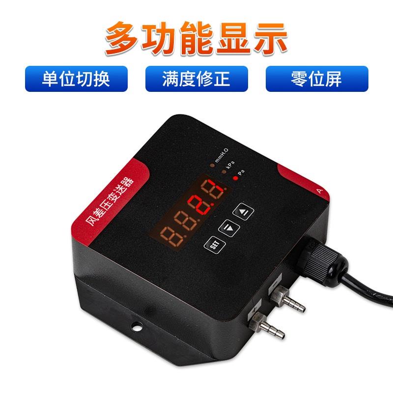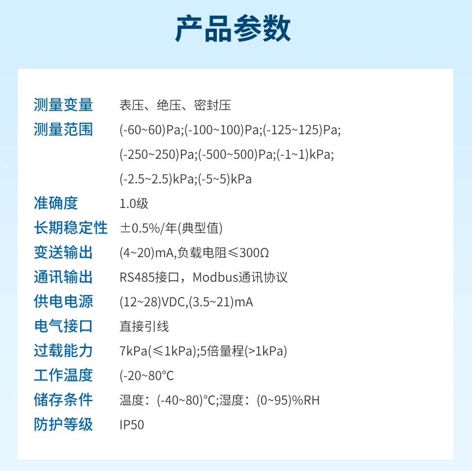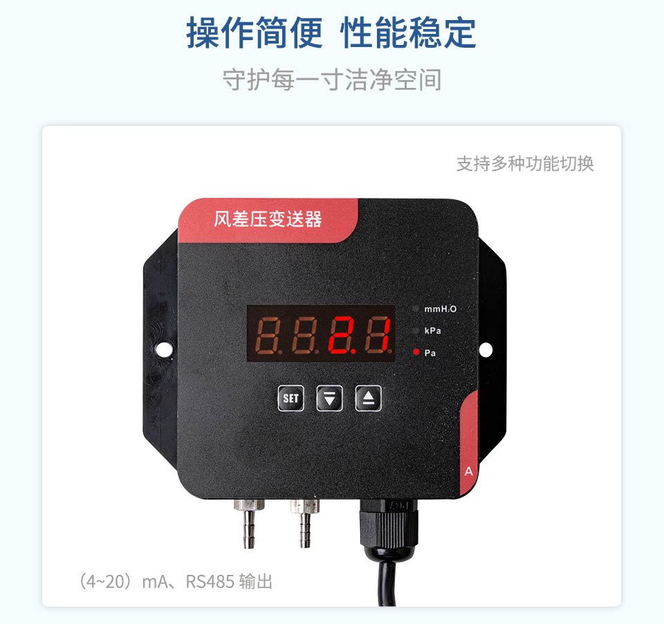 产品特点:采用原装进口差压传感器,精度高,稳定性好;支持多种功能:单位切换、满度修正和零位屏;支持(4~20)mA、RS485 输出