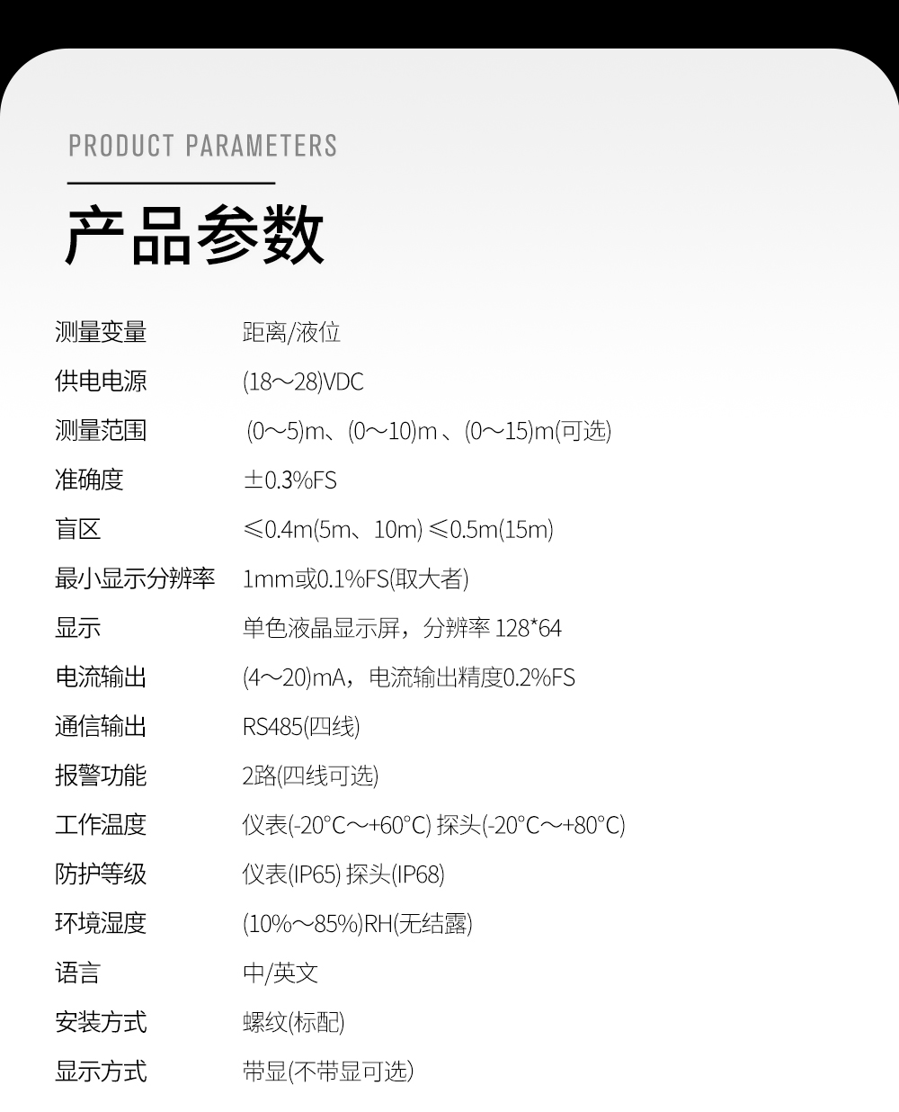 准确度:0.3%FS盲区: ≤0.4m(5m、10m) ;≤0.6m(15m)防护等级:仪表(IP65) 探头(IP68)
